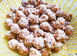 6. 捏丸子:用手将鸡肉捏成一个个小丸子,注意要捏紧,以免煮的时候散开。
